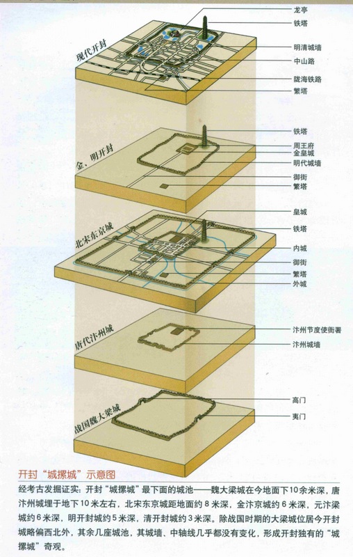 中国的八大古都河南有四,历史上众多重大历史事件、重要人物都发生或活跃在中原大地。 所谓的城摞城一般认为:在如今地面下10余米深有魏国国都大梁城,距地面10米左右为唐汴州城,约8米处北宋东京城,约6米深金汴京城,而5米———6米深明开封城和3米深左右的清开封城,这样的结果据说是考古工作者们进行了二十多年的勘探研究的成果。最直接的证据有三: 1981年5月中旬在潘家湖清淤堆岛施工中发现明周王府的府邸。 其二处是“在1984年8月17日至9月13日,开封考古工作者在中山路地下4.5米处发现并挖掘出了州桥,根据对州桥桥面的清理和对桥孔内的实测,该桥南北长17米、东西宽30米、孔高6.58米、拱跨5.8米,据说桥券内跑公交车绰绰有余。可惜因为桥的两端上面都是大型建筑物,无法进一步发掘,考古工作者只能回填”。第三处是“2000年5月,为了印证开封城摞城的传说,开封市城墙文物保管所选择了城墙西门城楼的一段城墙地下部分挖掘出一个考古探方,结果发掘出一段保存完好、清晰可见的清中期古马道遗迹。更令人惊奇的是,在第二层古马道下约50厘米深处,年代更为久远的古马道也惊现出来。三层古马道真切展示了开封城摞城的奇特景观。